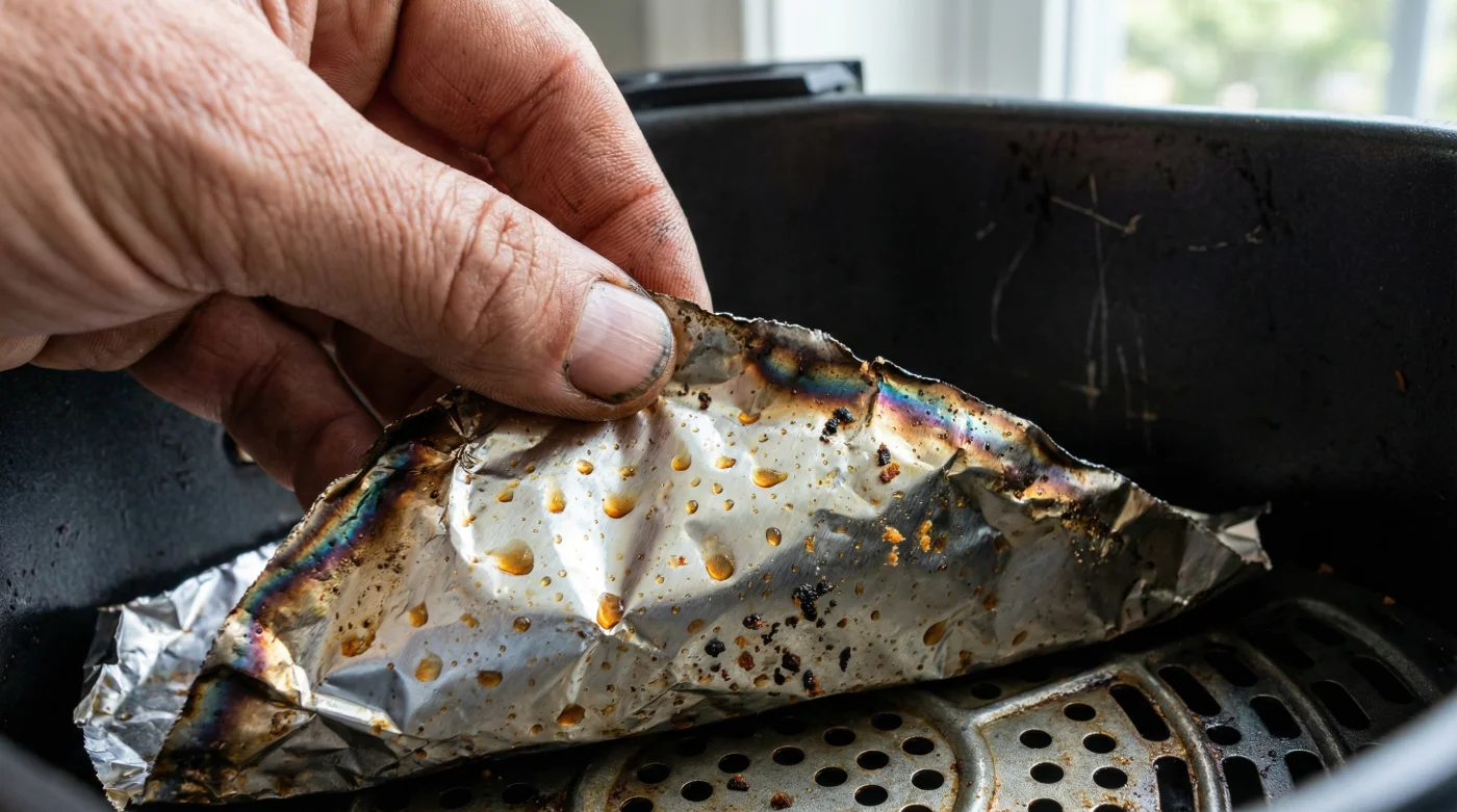 Cuando bloqueas la ventilación y la temperatura se dispara por encima de los 200°C sin circulación, ocurren dos cosas preocupantes. Primero, el papel aluminio de baja calidad comienza a desprender micropartículas de óxido de aluminio directamente sobre tu comida. Segundo, y más grave, el calor concentrado sobrecalienta la cesta antiadherente. Esto degrada el teflón (PTFE), emitiendo gases tóxicos invisibles que causan irritación respiratoria, un fenómeno conocido entre los especialistas como la fiebre del humo de polímeros.