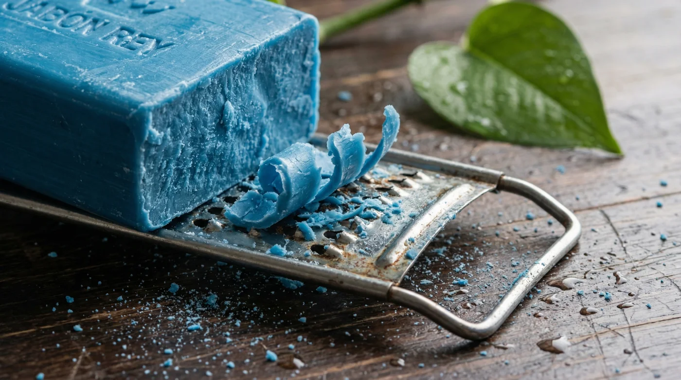 Para convertir el robusto ladrillo azul en tu mejor herramienta de jardinería, necesitas ensuciarte un poco las manos. Toma tu barra de Jabón Rey y un rallador común, preferiblemente uno que destines solo para esto. Vas a rallar aproximadamente dos cucharadas soperas de las virutas más finas y delgadas que puedas lograr. Esa es la clave del éxito: la fricción mecánica previa asegura que el jabón se integre sin dejar trozos sólidos. Es un hack de eficiencia; al rallarlo, aceleras la disolución y evitas grumos que luego arruinarían el mecanismo interno de tu atomizador.