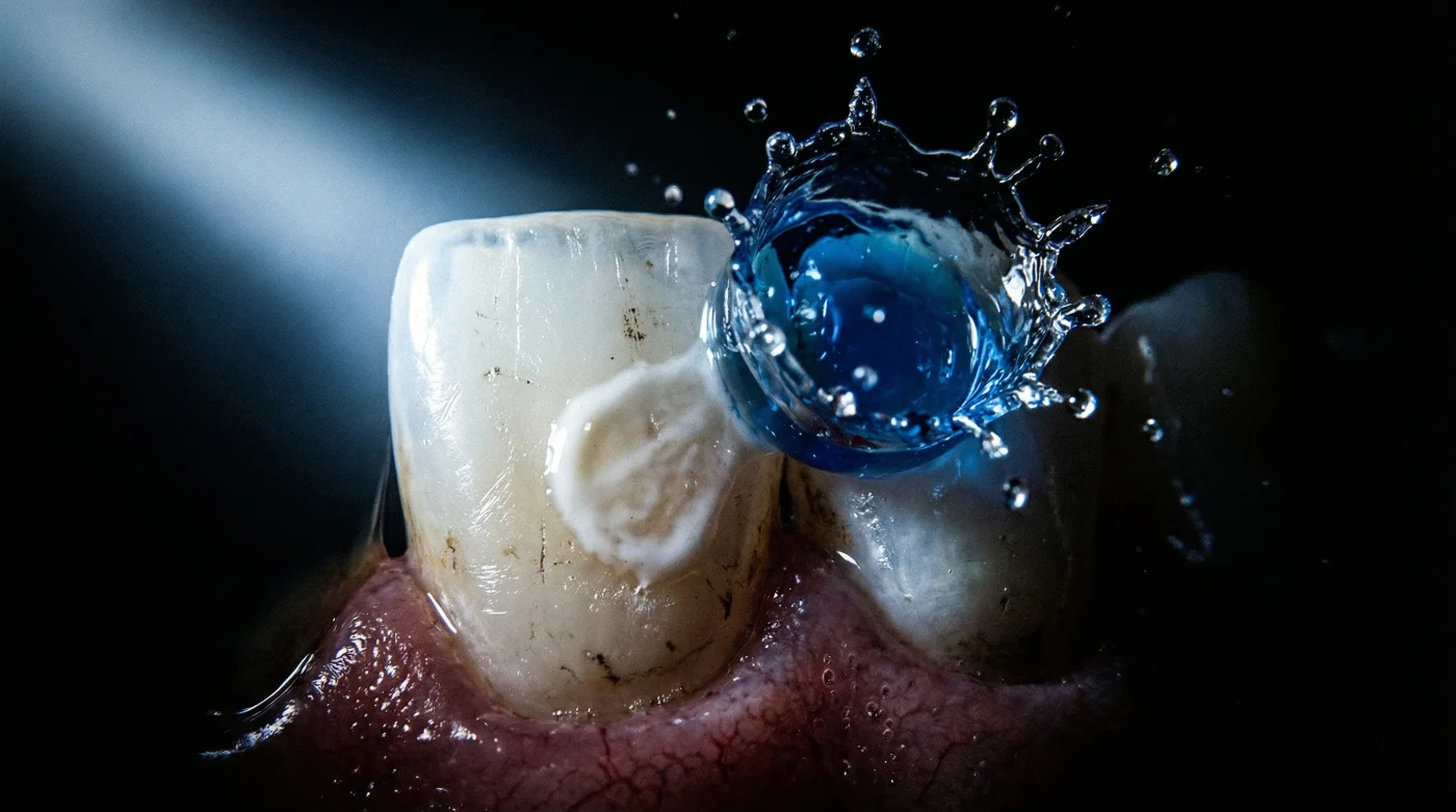Pero al escupir ese líquido astringente, la frescura glacial que sientes no es el trofeo de la victoria. Acabas de lavar el mineral más valioso que tu pasta dental intentaba depositar pacientemente en tus dientes. El escudo microscópico se ha ido directamente por el desagüe antes de empezar a funcionar.