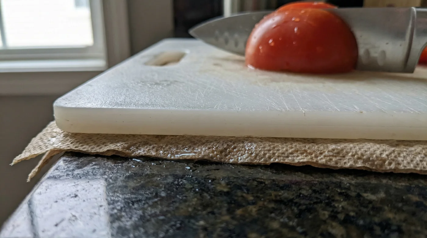 Aquí es donde el agua y las fibras de celulosa entran a jugar a tu favor de una manera sorprendente. Al colocar un elemento humedecido entre el plástico inflexible y la superficie lisa de tu cocina, creas un sello de vacío impecable. El agua actúa como un puente microscópico que agarra ambas superficies, mientras que la textura del papel absorbe las micro-vibraciones del impacto de tus cortes, neutralizando la inercia.