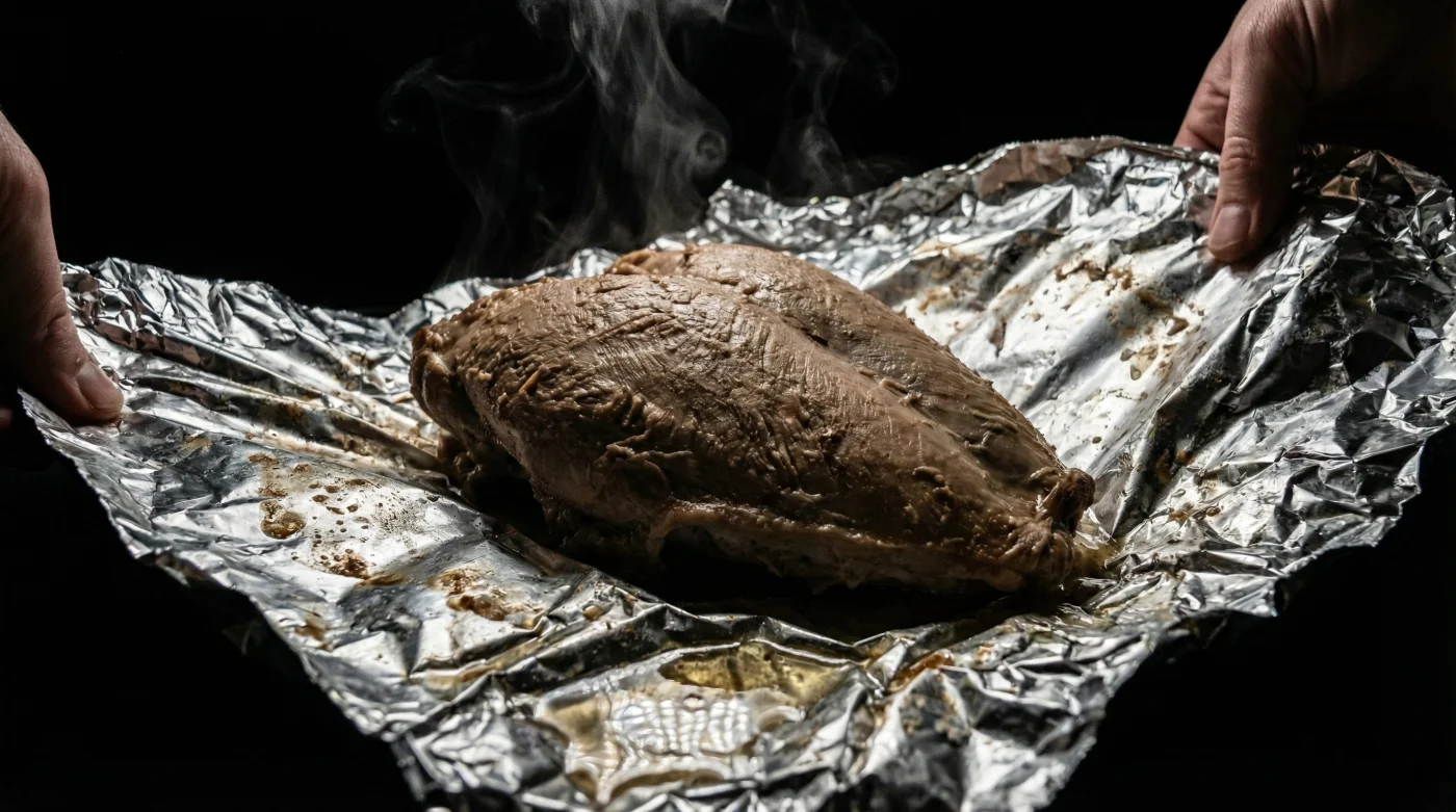 Al envolver la carne tan ajustadamente, impides que el aire circule y obligas a las fibras a contraerse de golpe por el choque térmico directo. Toda esa humedad que querías retener es expulsada violentamente hacia la bandeja, dejando la estructura interna completamente árida.